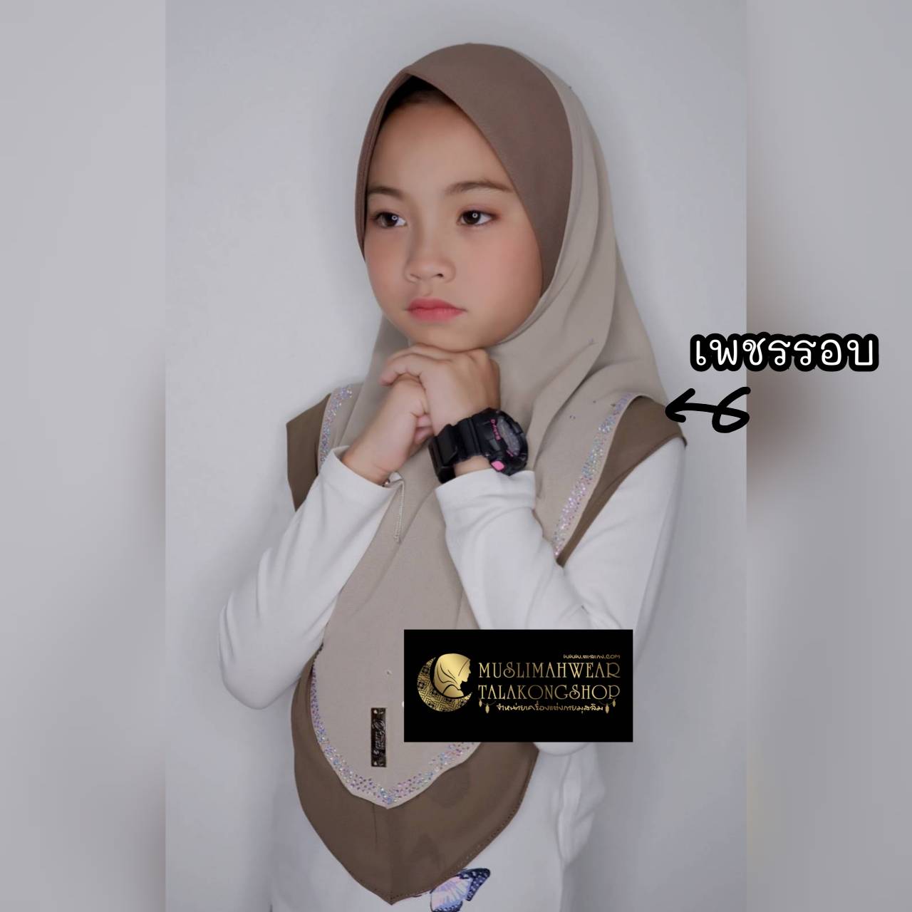 ผ้าคลุมหัวมุสลิม ฮิญาบแบบสวมสำเร็จ ผ้าชีฟองสองชั้น ติดเพชรรอบ Copy Swarovki เรียบๆ สวย ดูดี ทรงหน้าเป๊ะ เนื้อผ้า ชีฟอง2 tone ทรงหน้า Scuba ไซซ์ xs