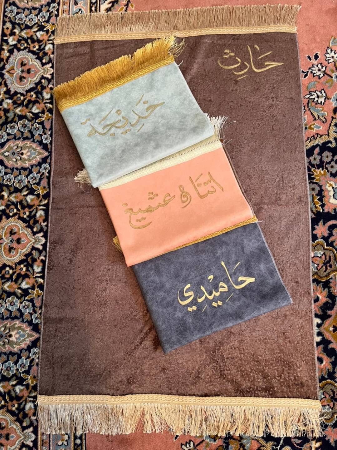 ผ้าปูละหมาดสลักชื่อ พรมปูละหมาดสลักชื่อ ผ้าปูละหมาดนำเข้าซาอุ ผ้าปูละหมาดซื้อเป็นของขวัญ พรมปูละหมาดซื้อใช้เอง ราคา 420บาทส่งฟรีลงทะเบียน สินค้าพร้อมส่ง พิมพ์ได้2ภาษา อาหรับ กับ อังกฤษ ภาษาที่2เพิ่ม 30บาทคะ