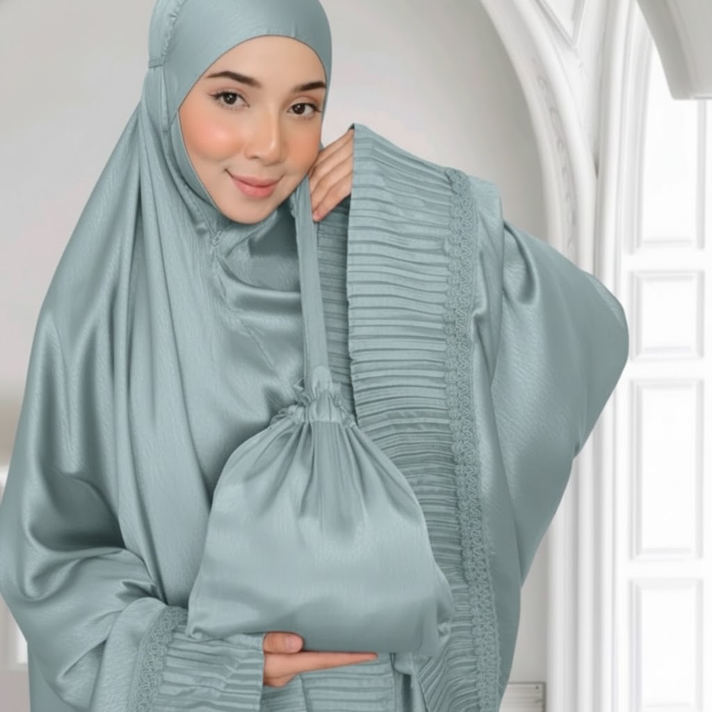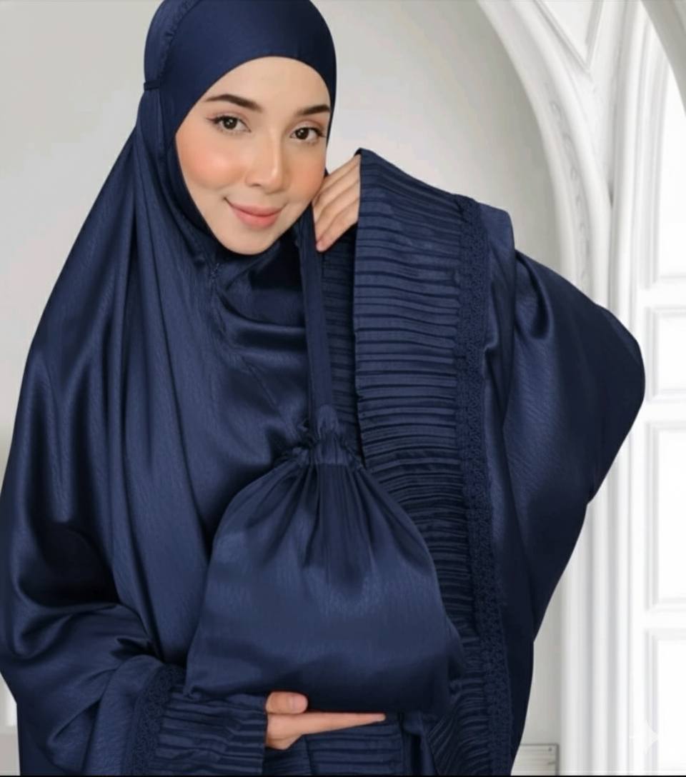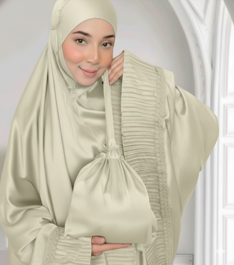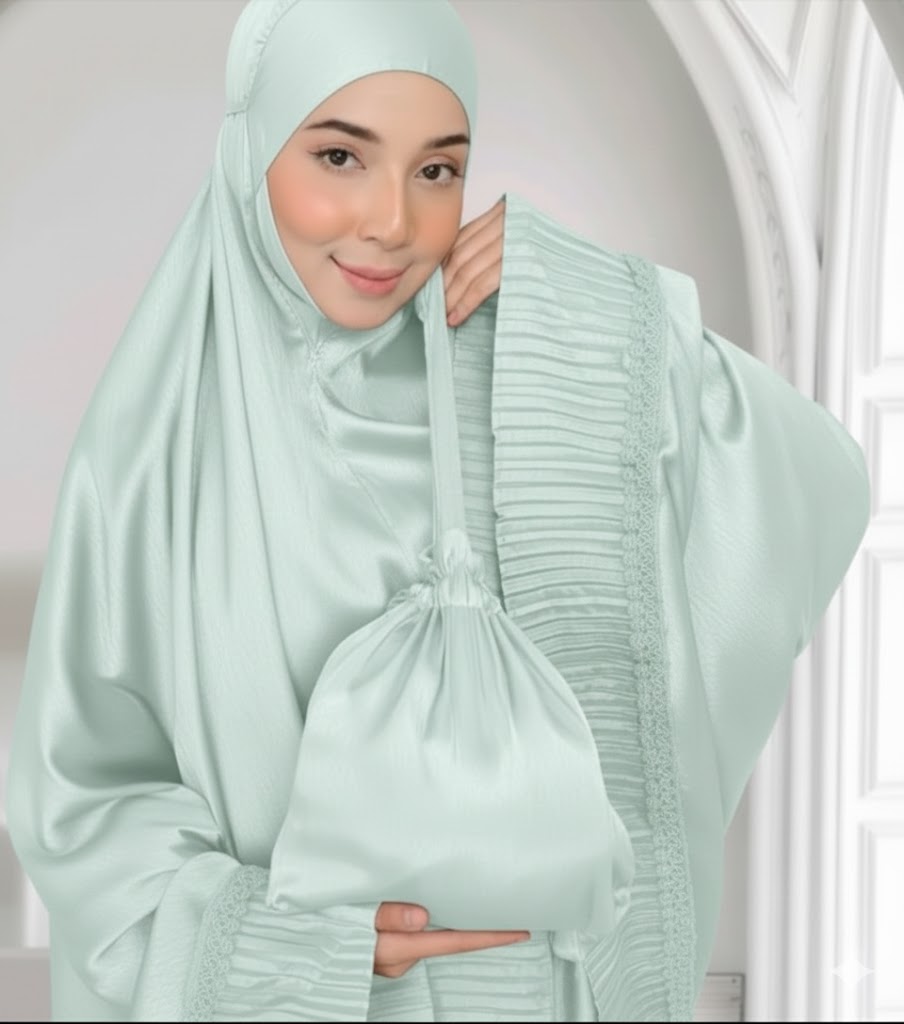 ชุดละหมาดเนื้อผ้า ซาตินแจ็คการ์ด นิ่มลื่น เนื้อเงาสวย ดีไซน์ ชายพลีทหรูรอบตัว เย็บประณีต รอบหน้าเป็นผ้ายืดนิ่ม ไม่รัดหน้า ใส่สบายตลอดละหมาด มี สายผูกกระชับหน้า ให้เข้ารูปพอดี ไม่หลุด ไม่เลื่อน
