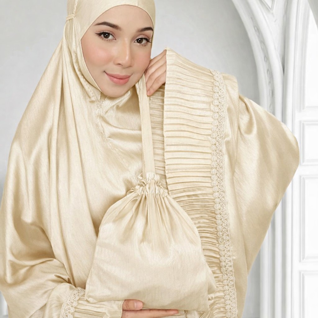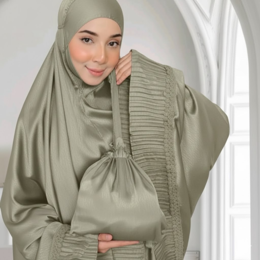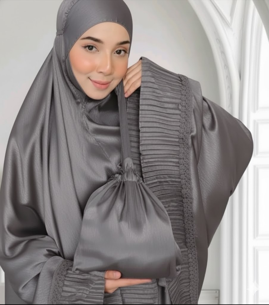 ชุดละหมาดเนื้อผ้า ซาตินแจ็คการ์ด นิ่มลื่น เนื้อเงาสวย ดีไซน์ ชายพลีทหรูรอบตัว เย็บประณีต รอบหน้าเป็นผ้ายืดนิ่ม ไม่รัดหน้า ใส่สบายตลอดละหมาด มี สายผูกกระชับหน้า ให้เข้ารูปพอดี ไม่หลุด ไม่เลื่อน