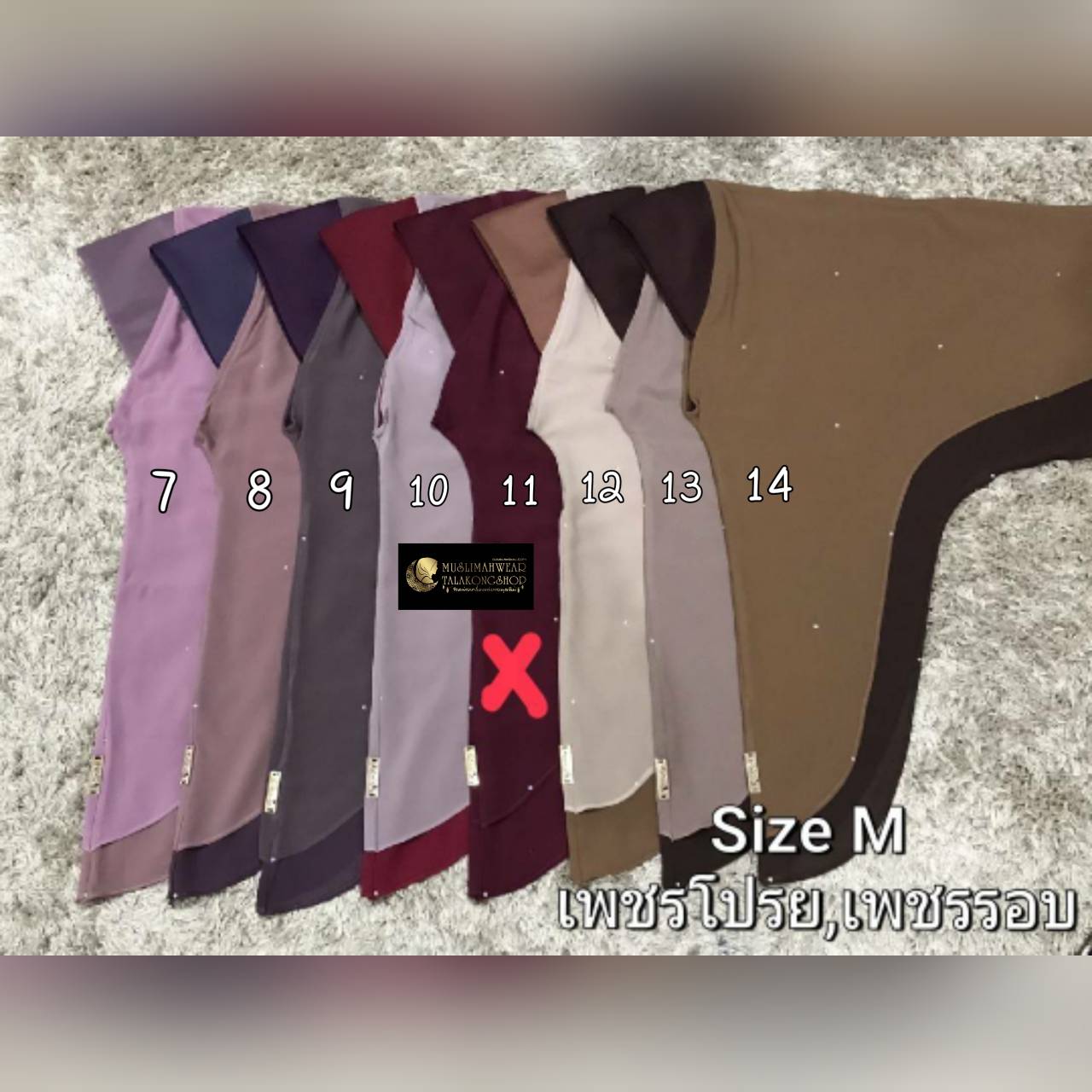 ผ้าคลุมหัวมุสลิม ฮิญาบแบบสวมสำเร็จ ผ้าชีฟองสองชั้น ติดเพชรโปรย Copy Swarovki เรียบๆ สวย ดูดี ทรงหน้าเป๊ะ เนื้อผ้า ชีฟอง2 tone ทรงหน้า Scuba ไซซ์ M แบบเพชรโปรย ขนาดหน้ากว้าง 11-11.5นิ้ว วัดจากหน้าผากมาคาง