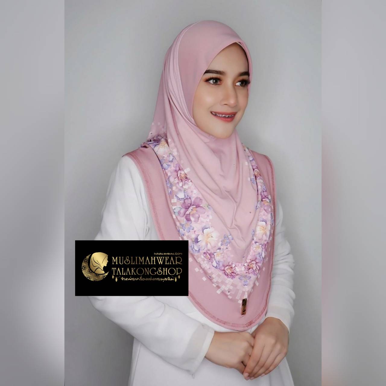 hijab ผ้าคลุมหัวมุสลิม แบบสวมสำเร็จงานผ้าลายในตัว ไซส์ L เนื้อผ้า Moss crepe ผ้านุ่ม ใส่สบาย ลายเก๋ ทรงหน้า Scuba ทรงหน้าเป๊ะ เป็นทรงง่าย